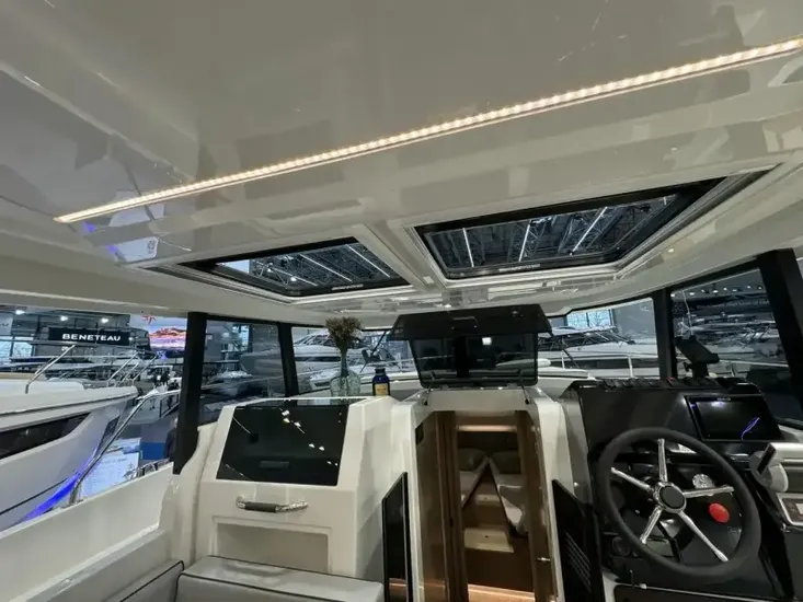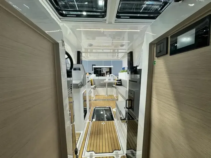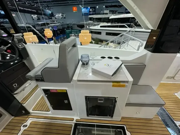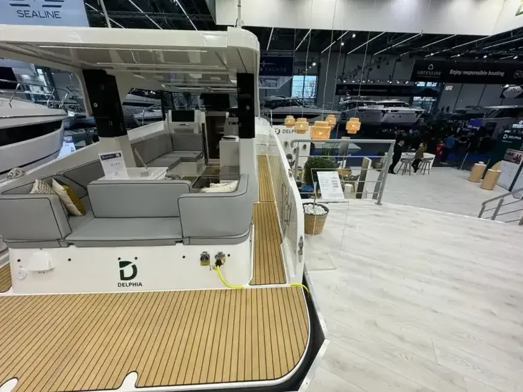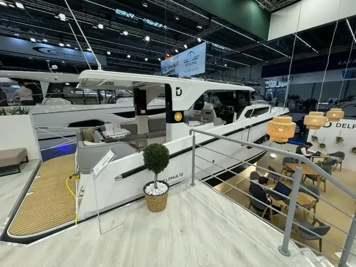 New Delphia 10 with single Yanmar 110hp Diesel engine. Thanks to optimised circulation and a single-level platform, you can smoothly move around onboard with ease. The open design of the cockpit creates a warm and inviting space, with 12 seats in a face-to-face configuration, finished in “Carbon” upholstery. This example features two cabins with single bathroom and walk-in shower. Specification includes: “Lounge” trim level pack* Bow and stern thruster, 30l drawer fridge in saloon, Diesel heating and more. *details of pack shown in “brokers notes”