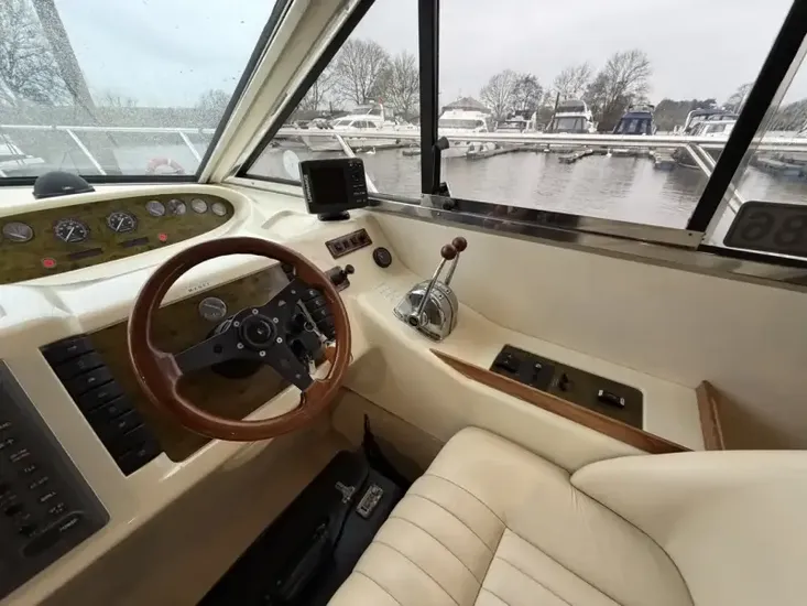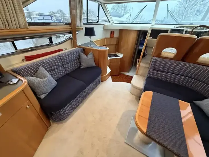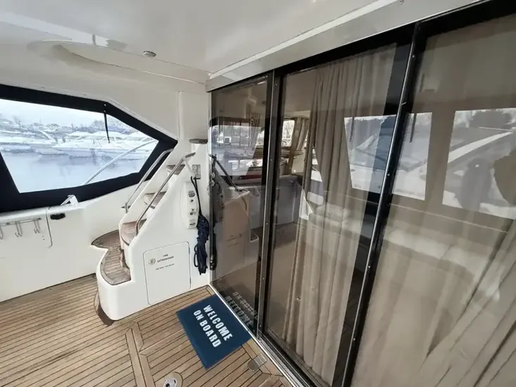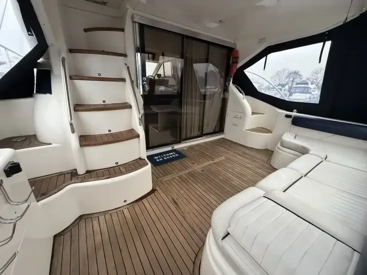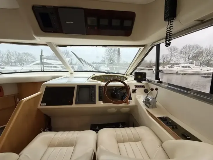 The Princess 430 Flybridge features a beautifully crafted exterior that boasts a generous flybridge, perfect for enjoying panoramic views while cruising. The expansive cockpit, enhanced by a canopy extension, provides ample seating and comfort, ensuring that you can entertain guests or relax in style regardless of the weather.